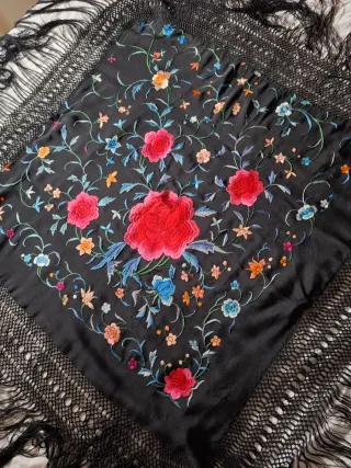 Elegante mantoncillo de Manila con un precioso bordado floral. Seda bordado a mano antiguo. - Flores bordadas en tonos rojos, azules y rosas. - Flecos largos y densos, mide 75cm por 75cm mas enrejado y los flecos.
