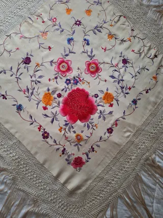 Elegante mantoncillo de Manila con un precioso bordado floral, seda bordado a mano. - Diseño con flores grandes y pequeñas en tonos vibrantes. - Flecos largos y detallados. - Tejido de seda color crudo, mide 75cm por 75cm más enrejado y los flecos.