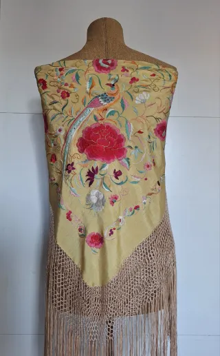 Precioso mantoncillo de Manila de seda en color amarillo pálido, con un intrincado bordado. - Diseño de pájaro exótico y flores. - Tonos vibrantes en el bordado. - Flecos largos y detallados, mide 80cm por 80cm mas enrejado y los flecos.