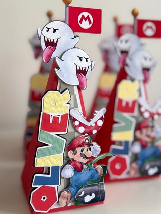 Caja pirámide temática de Mario Bros, ideal para decoraciones de fiestas. - Diseño con personajes de Mario Bros. - Estructura en forma de pirámide.