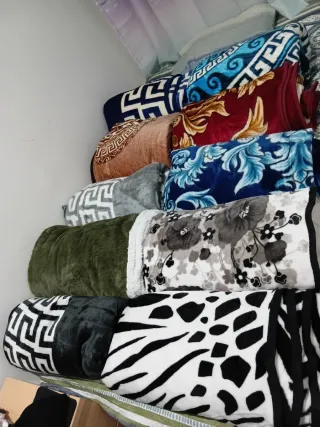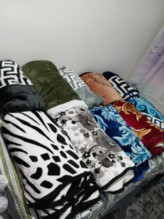 Conjunto de mantas con diversos estampados. - Manta con diseño de cebra en blanco y negro. - Manta con estampado floral en tonos grises. - Manta con diseño geométrico en azul y blanco. - Manta con diseño de grecas en tonos tierra. - Manta de color verde liso.