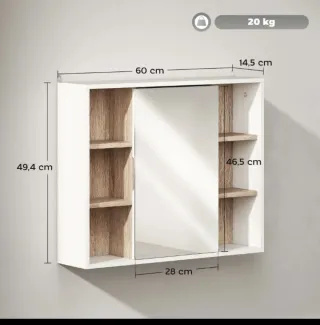 HOMCOM Armario Espejo con Espacio Interno con Estantes Ajustables Armario de Baño Montado en la Pared con Estantes Abiertos 60x14,5x49,4 cm Blanco y Roble 834-245