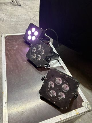 Lote de 4 focos LED American DJ FlatPar 5PX. - Focos tipo PAR con tecnología LED. - Carcasa negra. - Soporte para colgar o apoyar.