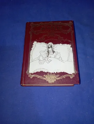 Libro de tapa dura con el título Justine. - Diseño de portada con detalles dorados. - Ilustración central en blanco y negro.