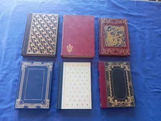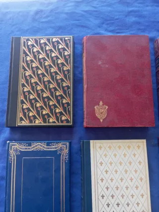 Conjunto de seis libros antiguos con cubiertas decoradas. Ideales para coleccionistas o como elementos de decoración. - Libro con diseño floral en tonos azul y dorado. - Libro de tapa dura en color burdeos con escudo. - Libro con ilustración dorada sobre fondo burdeos. - Libro de tapa azul con marco dorado. - Libro con patrón de rombos dorados sobre fondo blanco. - Libro con marco ornamental dorado sobre fondo negro.