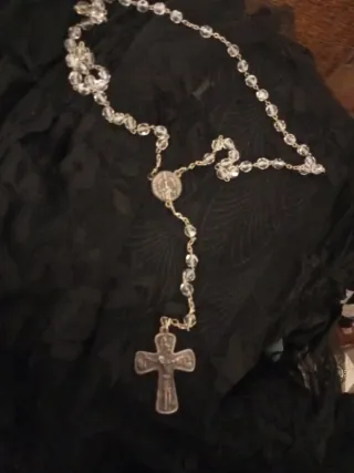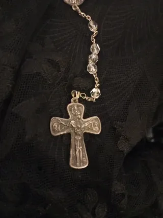 Este es un rosario antiguo con cuentas negras y detalles metálicos. - Cuentas facetadas de color negro. - Crucifijo detallado. - Medalla central con imagen religiosa.