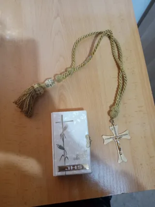 Conjunto para la Primera Comunión que incluye un librito y un colgante con cruz. - Librito con diseño de espigas y cruz. - Colgante con detalle de crucifijo y cordón dorado.Mi wassap es 674007325