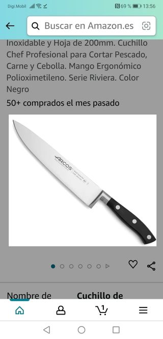 Cuchillo chef profesional para cortar pescado carne y cebolla. Mango ergonómico polioximetileno. Serie Riviera. Color Negro