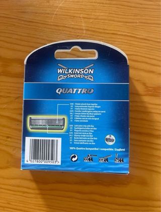 Cuchillas de afeitar Wilkinson Sword Quattro. Están nuevas. - 8 cuchillas en total. - 4 hojas colocadas juntas. - Banda lubricante con Aloe Vera. - 100% compatible con Quattro / Sword Quattro. Puedo hacer packs de hasta 4 paquetes.