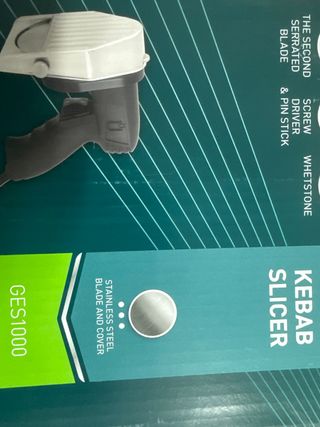 Cortador de kebab eléctrico con una potencia de 80W. Incluye una cuchilla serrada y otra de repuesto, además de un destornillador y una piedra de afilar. - Cuchilla serrada. - Segunda cuchilla de repuesto. - Destornillador y pin stick. - Piedra de afilar. - Cuchilla y cubierta de acero inoxidable. - Modelo GES1000.