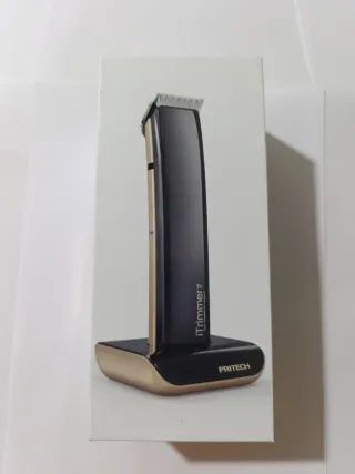 Recortadora eléctrica PRITECH iTrimmer7 con un diseño elegante en color negro y detalles dorados. - Cuchillas de precisión. - Base de carga. - Indicador LED.