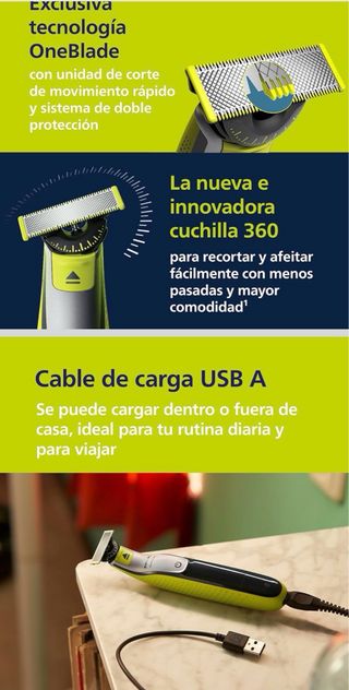 Máquina de afeitar y cortapelos Philips OneBlade. - Incluye 2 cuchillas. - Incluye 4 peines guía. - Incluye cable de carga USB. - Garantía de hasta 5 años.