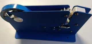 Máquina precintadora de color azul, ideal para sellar paquetes. - Diseño robusto de metal. - Cuchilla de corte con advertencia de seguridad.