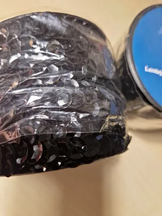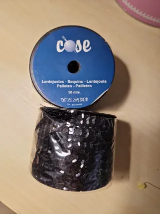 Rollo de lentejuelas negras de la marca Cose. - 50 metros de largo. - Lentejuelas de color negro. 1 cm de ancho 15 euros cada rollo