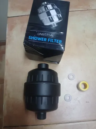 Filtro de agua para ducha, modelo universal. - Color negro. - Incluye dos juntas y cinta de teflón.