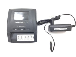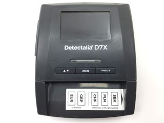Detector de billetes falsos en color negro. marca Detectalia D7 Se puede actualizar a nuevos billetes - Pantalla digital. - Botón de encendido/apagado. - Botones de función: MOD/CLR y REP/DIR.