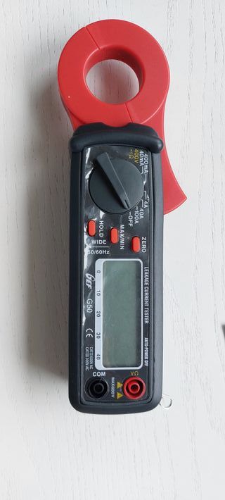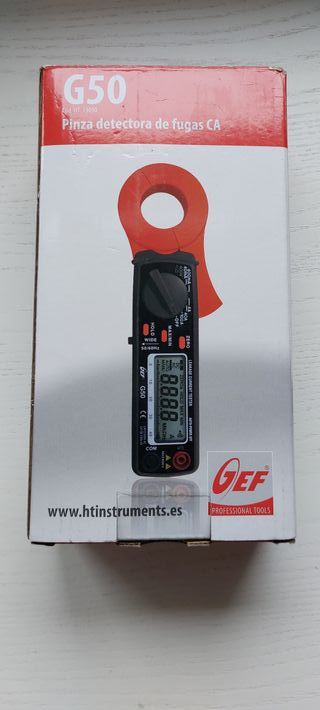 Pinza detectora de fugas CA marca HT GEF, modelo G50. Totalmente nuevas, en su embalaje original - Diseño compacto y ergonómico. - Pantalla digital para mediciones claras. - Incluye pinza para medir corriente de fuga.