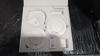 Detector de humo inteligente X-Sense XS01-M con estación base SBS50, certificado según EN 14604, detector de humo inalámbrico con WLAN, alarma contra incendios en red, compatible con la aplicación X-Sense Home Security, FS61, 6 piezas 850042393512 3 sensores en la cubierta posterior muestran signos de instalación, faltan 3,5 kits de montaje (tornillo + pasador)