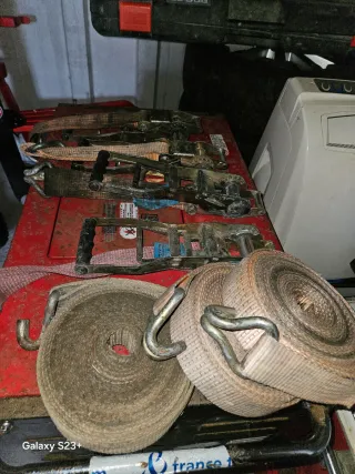 Precio por unidad o lote Conjunto de 25 cinchas de carraca para asegurar cargas. Son robustas y están listas para su uso. - Mecanismo de carraca para tensado. - Ganchos de metal resistentes. - Cintas de poliéster duradero.