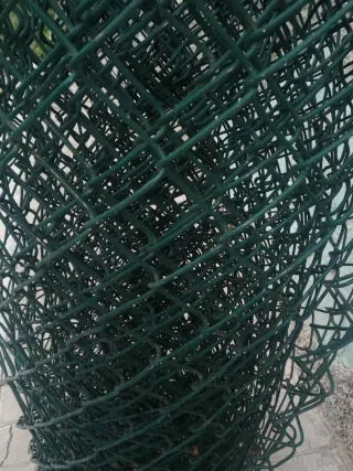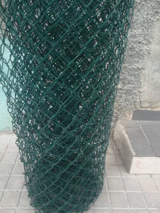 Rollo de malla metálica recubierta de plástico verde, ideal para cercados y delimitaciones. - Color verde. - Material: Metal con recubrimiento de plástico.