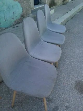 Conjunto de cuatro sillas tapizadas en color gris. Su diseño moderno las hace perfectas para cualquier espacio. - Tapicería de tela gris. - Patas de madera.