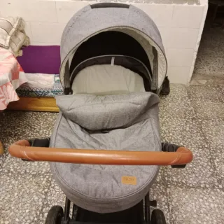 Cochecito de bebé en color gris, con detalles en polipiel. - Capota amplia. - Barra delantera. - Ruedas resistentes. El carricoche grande tiene las ruedas desinfladas pero se pueden hinchar.todo lo demás en buen estado y condiciones.