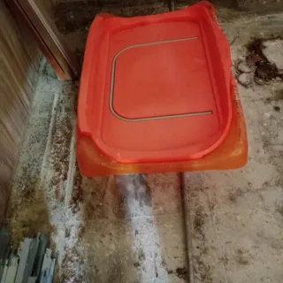 Bandeja de plástico de color naranja con un asa integrada. - Diseño rectangular. - Asa en forma de U.