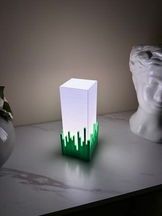 Lámpara decorativa inspirada en los bloques de Minecraft. Perfecta para los fans del juego. - Diseño 3D. - Base con iluminación verde. - Pantalla blanca.