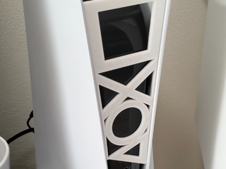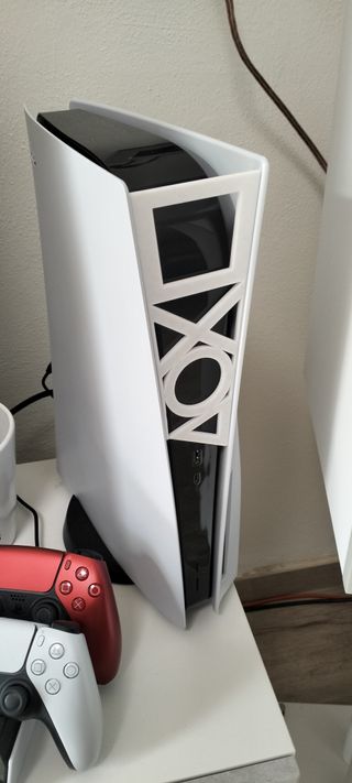 Decoración personalizada para tu consola PlayStation, fabricada con impresión 3D. - Diseño con los símbolos clásicos de PlayStation. - Acabado blanco mate.