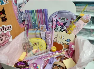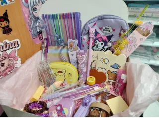 Caja llena de artículos kawaii de Sanrio, perfecta para fans de la cultura japonesa. - Incluye varios artículos de papelería como bolígrafos y un rotulador. - Contiene una bolsita de mano y un neceser. - Varios accesorios pequeños como crema de manos y bálsamo labial. - Diseños de personajes populares de Sanrio.