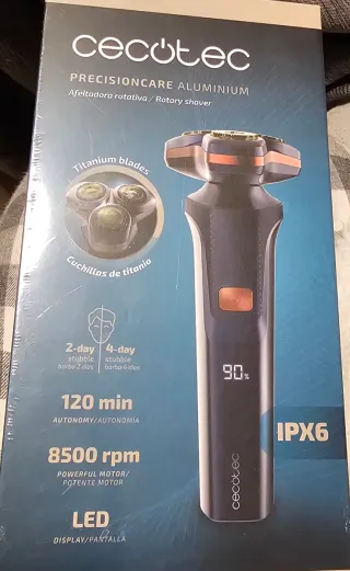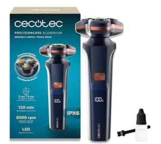 Afeitadora rotativa Cecotec Precisioncare Aluminium. - Cuchillas de titanio. - Autonomía de 120 min. - Motor potente de 8500 rpm. - Pantalla LED. - Resistencia al agua IPX6.