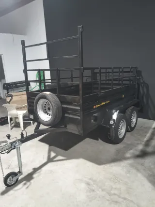 Remolque de carga con doble eje más info 672211402 - Doble eje para mayor capacidad de carga. - Rueda de repuesto incluida. - Barras de protección en la parte superior.