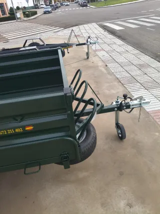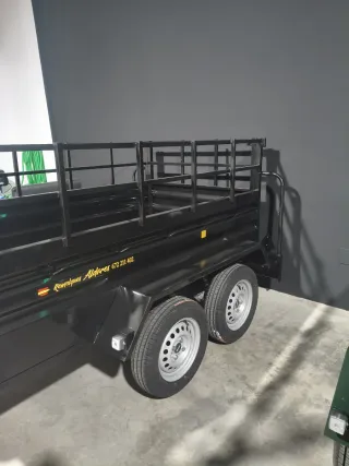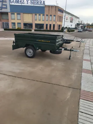 Remolque de carga de color verde con dos ejes. - Laterales abatibles. - Rueda de repuesto. - Medidas aproximadas: