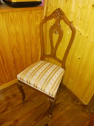 Elegante silla de comedor con estructura de madera y asiento tapizado. - Diseño clásico y detallado. - Tapicería con rayas doradas y florales. - Patas talladas.