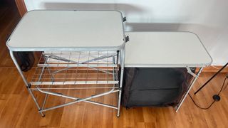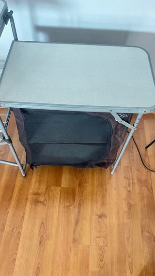 Mueble de cocina plegable, ideal para actividades al aire libre. - Estructura de aluminio. - Superficie de mesa resistente. - Compartimentos de almacenamiento. - Fácil de montar y desmontar. mide montado 1,33 x 82 tiene alguno desperfectos del uso de ahí su precio