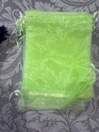 Conjunto de bolsas de regalo con cierre de cordón, perfectas para pequeños obsequios o detalles. - Material: Organza. - Color: Azul marino y verde lima. - Cierre: Cordón con detalle de flecos en las azules y verde. 17 unidades verde 12€ 22 unidades azules 16€