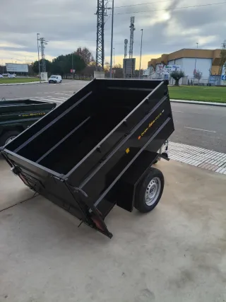 Remolque basculante de color negro, ideal para transporte. - Rueda de repuesto incluida. - Puerta trasera abatible.
