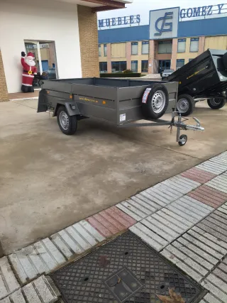 Remolque de carga de color gris, ideal para transportar diversos materiales. - Rueda de repuesto incluida.