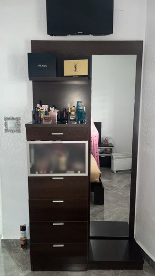 Mueble tocador con espejo integrado y varios cajones para almacenamiento. - Diseño moderno en color oscuro. - Cajones con tiradores plateados. - Compartimento con puerta translúcida.