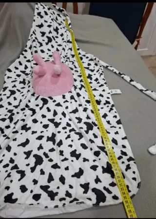 Delantal con un divertido estampado de vaca, perfecto para la cocina o para disfraz. - Diseño de vaca en blanco y negro. - Incluye un detalle de peluche rosa en la parte delantera. Se vende también, como parte del lote, un paño de cocina y una bolsa de regalo.