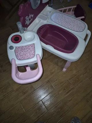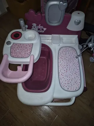 Set de juego para muñecas que incluye trona, cuna y bañera. - Diseño en color blanco y rosa. - Incluye accesorios como grifo y lavabo. - Marca Smoby.