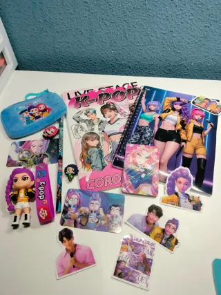 Colección de artículos de merchandising de K-Pop. - Incluye figuras, pegatinas y llaveros. - Diseños inspirados en grupos populares. - Ideal para fans del K-Pop.