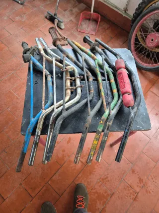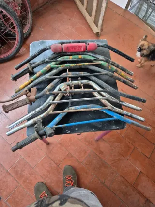 Lote de manillares para Puch. Variedad de modelos y acabados. - Incluye manillares de diferentes colores como azul, verde y negro. - Algunos presentan detalles de óxido, como se aprecia en las imágenes. - Piezas ideales para restauraciones o proyectos personalizados.