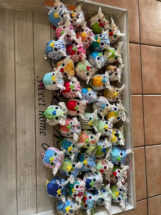 Llavero buho de la suerte ,de tela con varios estampados, blandito muy dulce ,hecho a mano sin pegamento.para bolso llaves mochila coche. Para regalar a las mamis o chicas tienen mucho éxito,con esto seguro q triunfas. Hago lotes uno 3 € Por cada 6 unidades uno de regalo,