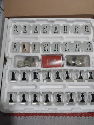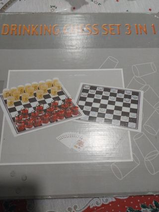 Juego de beber super xulo 3 en uno...ajedrez...damas...poker...para pasar una velada entretenida. Esta nuevo oero la caja esta deteriorada