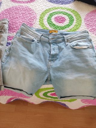 3 Pantalones cortos vaqueros de color gris,azul,y azul clarito. Tienen un diseño moderno y son cómodos para el día a día. - Cintura con trabillas para cinturón. - Cierre de botones. - Bolsillos delanteros y traseros. Y 3 polos,negro,amarillo y rojo+camisa. Todo 20€