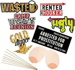 Kit de accesorios para fotos divertidas y selfies. Incluye varios carteles y elementos para animar tus fiestas. - Photo Bombing! Props - Incluye 7 accesorios para selfies. - Diseños variados como Rented Hooker, Wasted, Gold Digger, Camp Ugly Reunion, Arrested Prostitute y Ugly Reunion. - Edad recomendada: 18+.