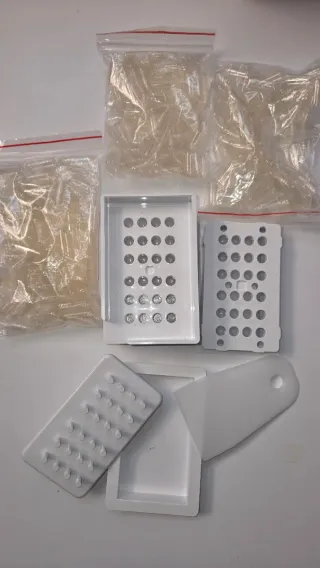 Dispositivo para el llenado de cápsulas. - Capacidad para 24 cápsulas. - Fabricado en plástico blanco. -Incluye cientos de cápsulas vírgenes estériles.