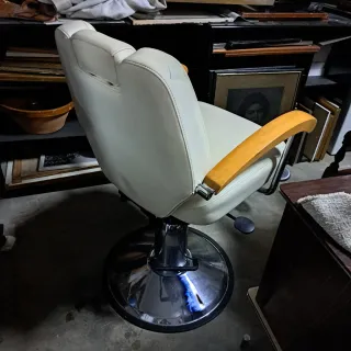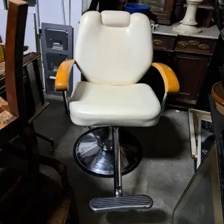 Sillón de barbero con un diseño clásico y elegante, ideal para salones de estética o barberías. - Tapicería de polipiel color crema. - Reposabrazos de madera. - Base redonda cromada. - Reposapiés metálico.