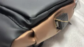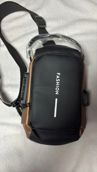Bolso cruzado moderno con un diseño bicolor en negro y bronce. - Compartimento principal espacioso. - Correa ajustable para mayor comodidad. - Puerto USB integrado para carga. - Detalle de línea reflectante en la parte frontal.